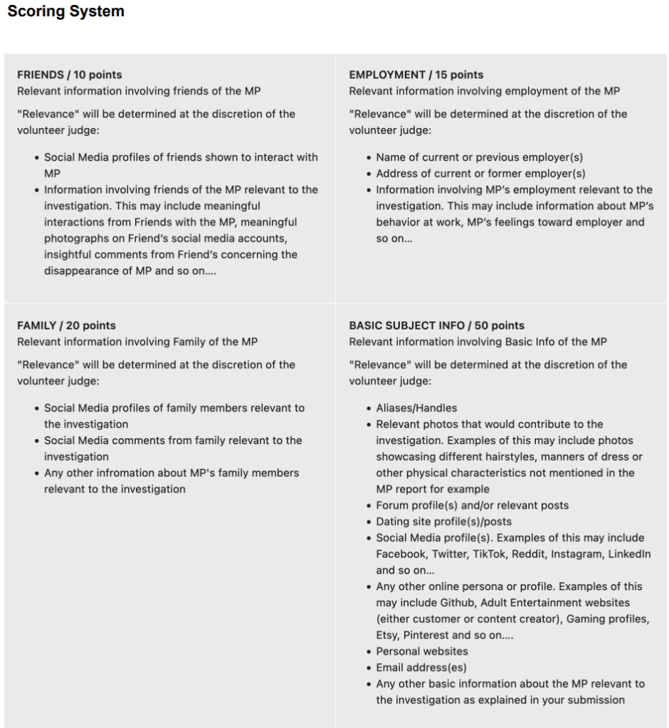 Before the competition, a few missing person gets choosen by the law enforcement and Trace Labs management team. Teams start with inspecting the police adverts. Then they get busy crawling the internet for their online fingerprints. As they find traces they submit their findings to the team coaches. Teams moslty get their submission category right. But the duty of the coaches is to be the second evaluation eye. Check the category and be the filter wheel of this big system. There is a list of categories and their points defined by the Trace Labs team.