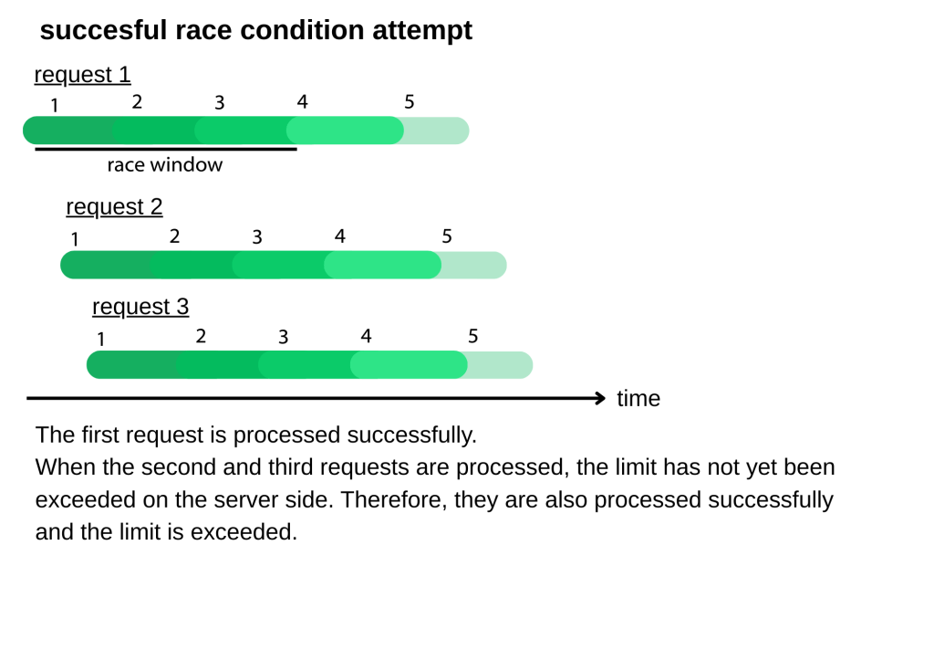 When the record check is performed for the first outgoing request, the number of records is 4. Therefore, the request continues to be processed. When the second request begins to be processed, the number of records is still 4 because the first request has not yet been completed. This situation also applies when the third request begins to be processed. When the processing of these requests, which take advantage of the short time interval required for this vulnerability to exist, is completed, the number of records has increased to 7. The request did not hit the limit while being processed because the number of records was 4 when all requests began to be processed.